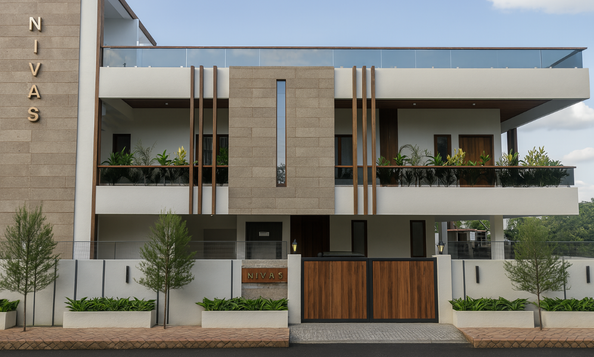 The facade design employs a rectilinear massing with pronounced vertical fins in teak-toned composite wood, creating a strong rhythm and anchoring the elevation. A central stone-clad core punctuated by a narrow slit window ensures both visual symmetry and passive daylighting. The use of exposed natural materials textured stone, smooth white plaster, and warm wood finishes—establishes a refined material palette. The clean horizontal bands of the parapet and balcony slab are counterbalanced by the vertical elements, ensuring a harmonious proportion and scale. Strategic planting softens the built form while enhancing the urban frontage.