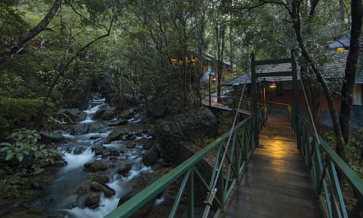 Nestled among the lush tea estates of Coonoor, EkoStay Winterfell Chalet offers a quaint hillside retreat. Its pitched roofs, white façade, and cozy interiors reflect a colonial charm while embracing the natural terrain and views.